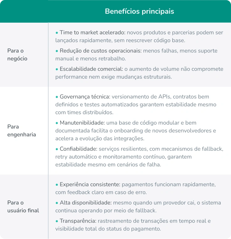 - Redução do time to market: novas funcionalidades e métodos de pagamento podem ser implementados rapidamente, sem precisar refazer toda a estrutura.