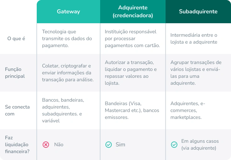 Na tabela abaixo, você tem um resumo das diferenças entre gateway de pagamento, adquirente e subadquirente.