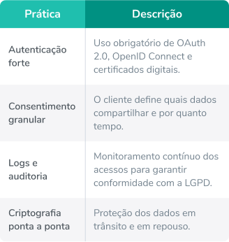 Além disso, na tabela a seguir apresentamos as boas práticas de segurança para integrações no Open Finance: