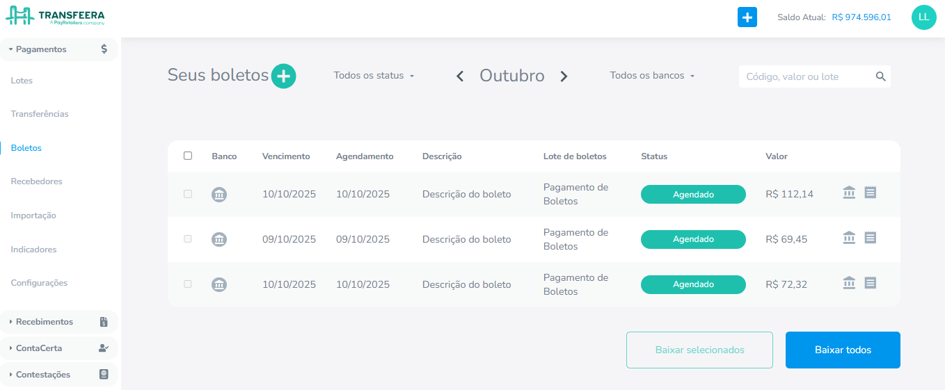 No caso de relatórios de pagamentos e recebimentos, você pode utilizar a plataforma da Transfeera e visualizar: